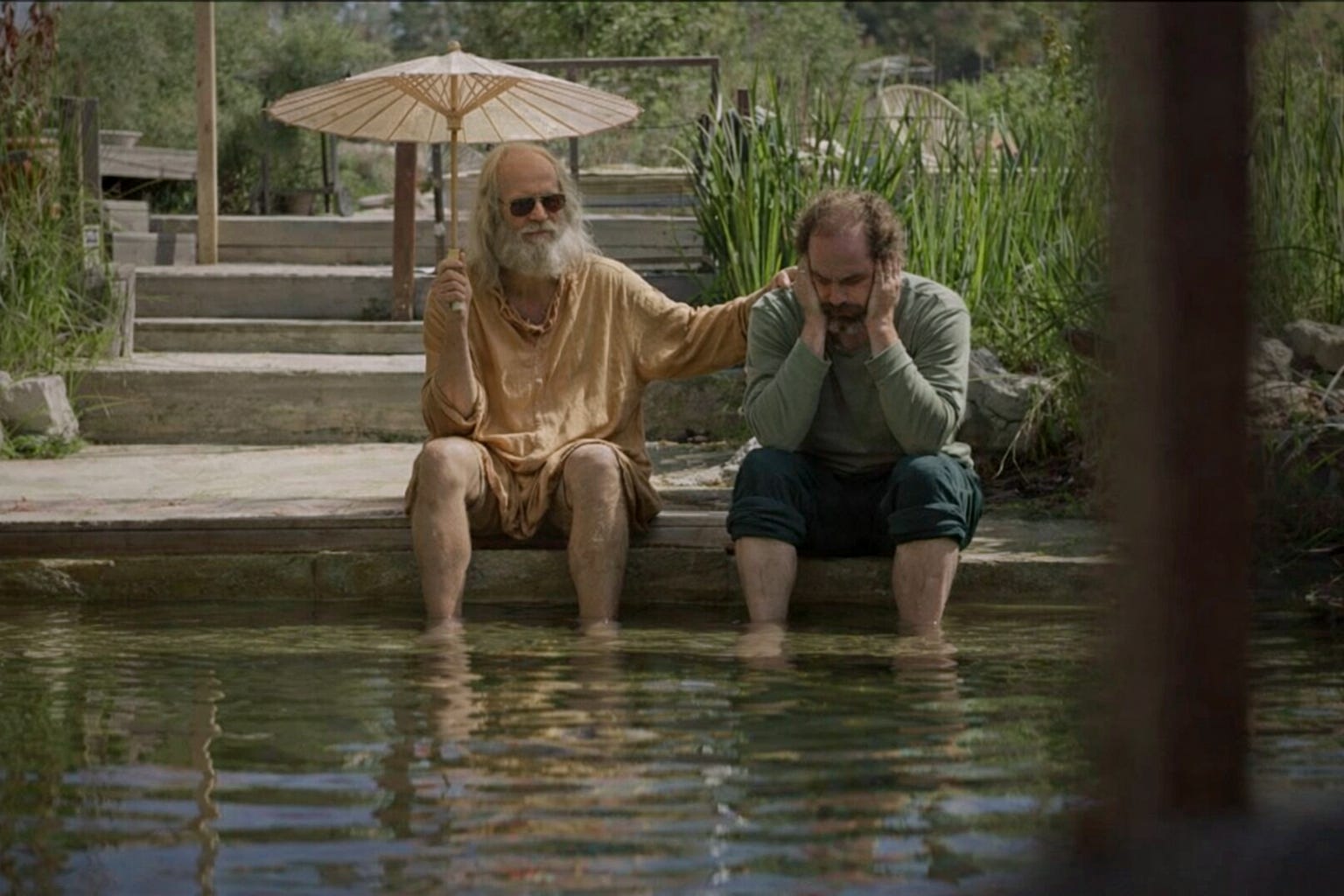 Taliasur, Jess and I sat by the very nice natural pool. Suri Ma came out and without rushing me, said that Sur was up and would be happy to meet me. Taliasur got up to lead Sur from his bedroom and over to me holding a parasol, and with some help getting down from Suri Ma, he sat next to me, both of us with our feet in the water.